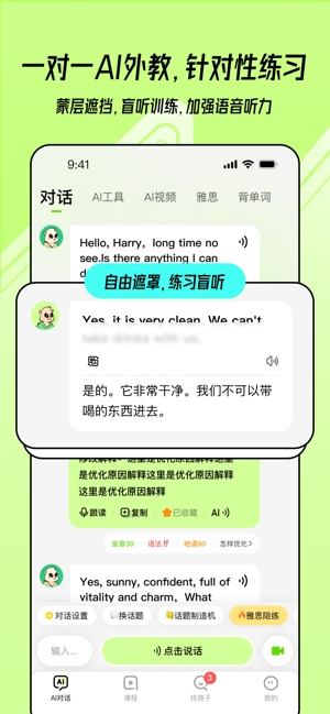 我们的应用程序还集成了翻译与跟读功能,允许你无缝地将任何对话翻译成所需的语言。不仅扩大了词汇量、还能获得地道口语表达,应用程序都帮你完美解决。这意味着你可以专注于真正重要的事情——练习你的口语技巧——而不用担心语言障碍或误解。