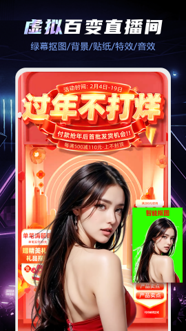1080P超高清抠像技术,支持精细调节抠像强度,有无绿幕都可完成抠像;还可自定义添加绿幕保护区,让您的绿色产品也能轻松展示;通过人像裁剪,即使没有绿幕的边角处也无需担心露出实景。