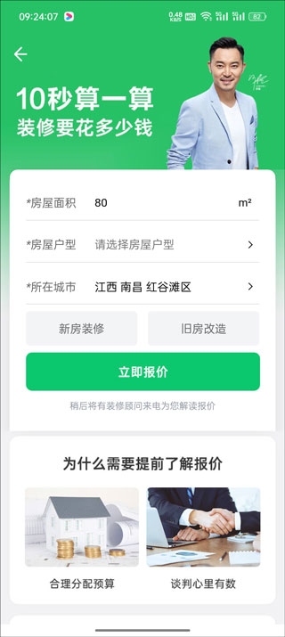 3、紧接着选择自己的【户型、城市、面积】然后点击报价