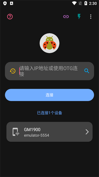 4、此时,我们在新的设备上打开甲壳虫ADB助手,输入被控机的IP地址和端口,就可以连接到手机设备了。