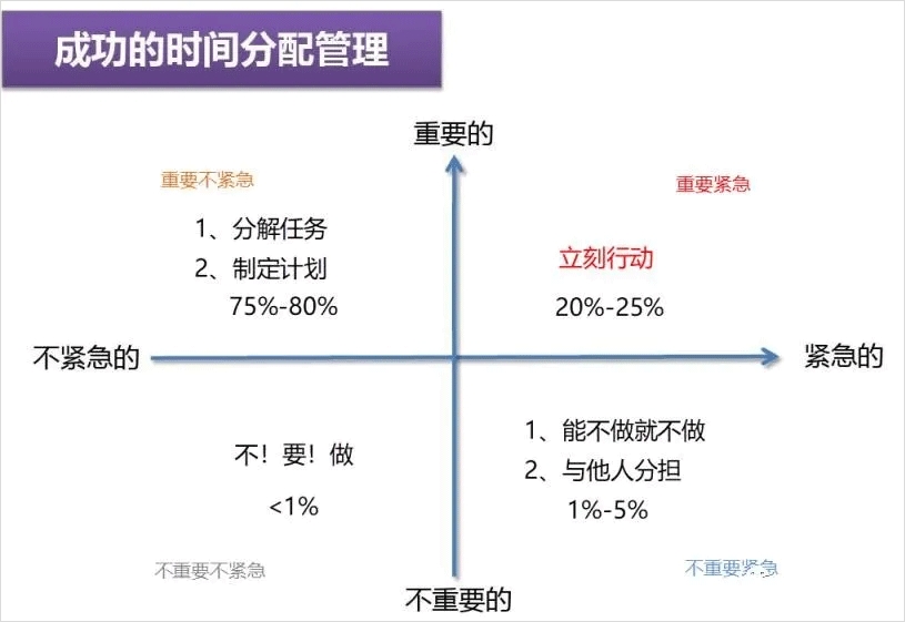 (1)紧急且重要:这个象限里的任务通常是工作上的紧急任务或是需要立即完成的事项,这些任务对你的工作和生活都有重大的影响。