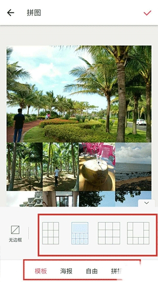 2、拼图功能不局限与照片,视频也能可以的哦,但最多支持9张图片或视频,待你选择好之后就能开始拼图啦!进入功能体验区之后,分别有模板、海报、自由、拼接这四大功能,期间你还能根据需要进行部分裁剪,添加音乐,也可以直接使用模板进行套装应用!