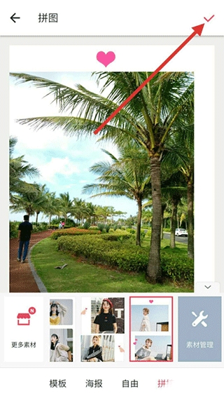4、设置模板和排列方式之后,点击右上角的“√”这个符号,表示拼图完成。
