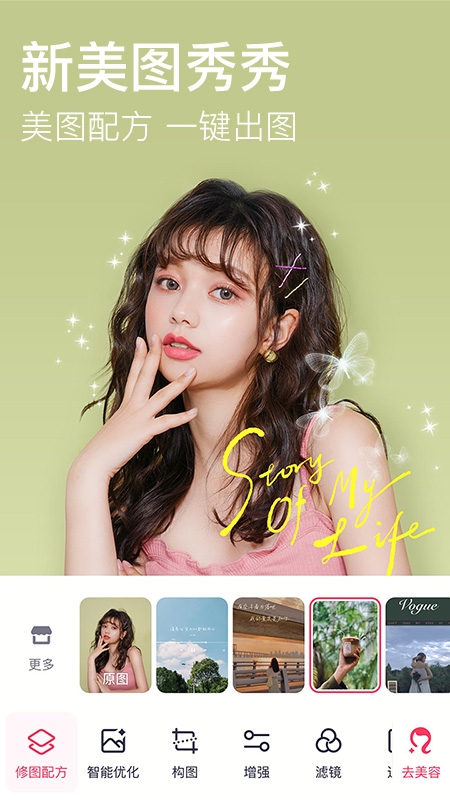 美图秀秀是一款由美图网研发的免费影像处理软件,全球用户超10亿。拥有强大的修图、美颜功能,包括瘦脸瘦身、美白祛痘等,还能制作GIF动态图片。其滤镜相机和动态相机功能,可让用户随时随地记录美好瞬间。