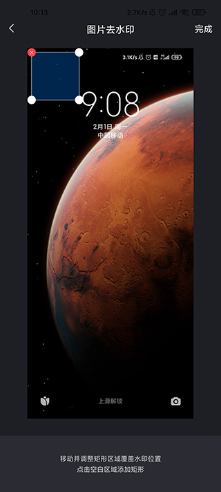 - 【图片去水印】:只需要导入图片到app,框选出你要去除的水印部位,点击完成就能消除水印。