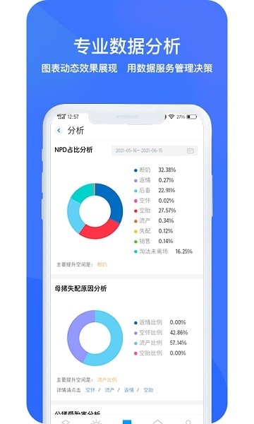 通过数据化管理,形成猪场的数据积累,自动生成数据分析报告,实时分析猪场绩效,横向分析全集团所有公司的生产指标、实时存栏、成本和销售业绩,为猪场制定解决方案提供有效的数据决策依据。
