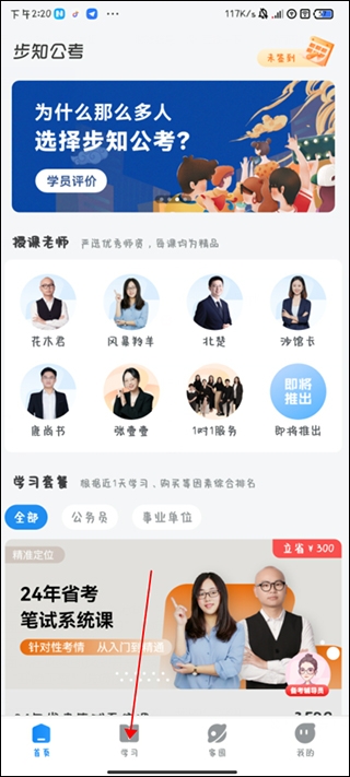 1、打开步知公考app,进入app首页,点击页面下方的“学习”按钮;