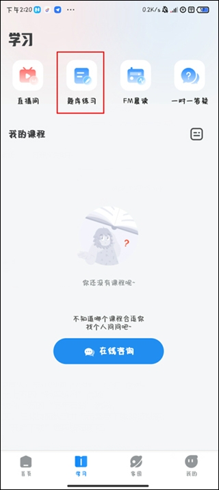 2、进入到学习页面,再点击页面上方的“题库练习”选项;