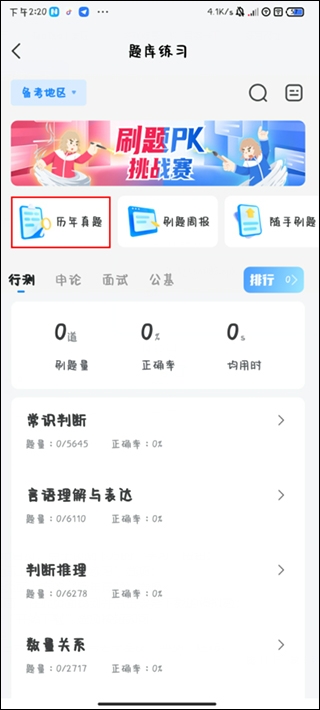 3、来到题库练习页面,再点击页面上方的“历年真题”选项;