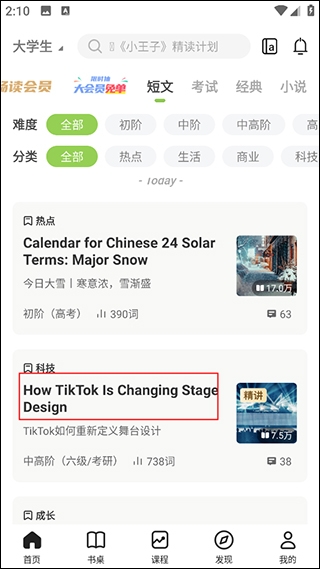 你每天的学习进度,都会通过图表生动展示,包括每日的单词和短文数。