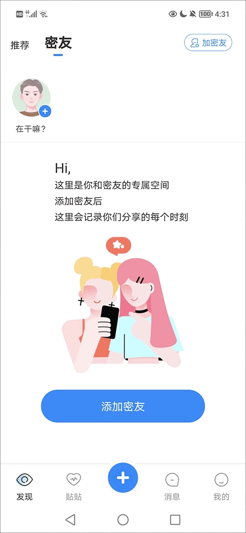 1、首先,打开软件,在软件的发现界面找到并点击“添加密友”选项;