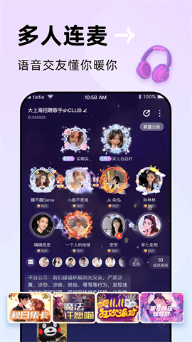 各类主题语音连麦,一起玩游戏,有默契,上分更容易;一起听歌,温暖陪伴不孤单;一起CPDD,遇到对的人;一起抢唱,开启嗨唱对决;