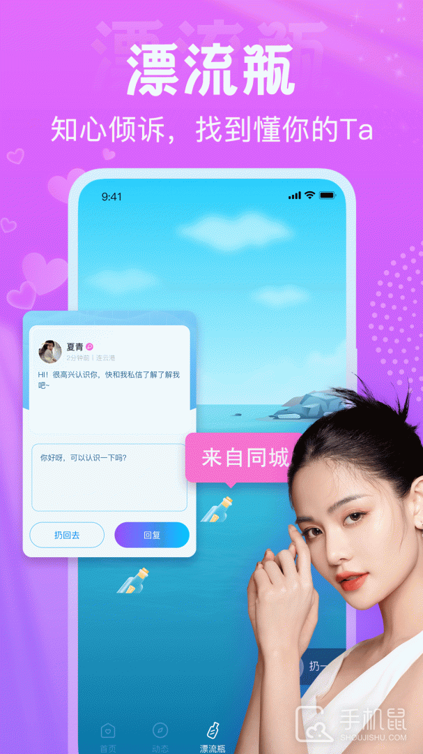 【漂 流 瓶】自己想说的话通过瓶子进入大海,别人捞出来可以给你回信,还可以捞出别人丢出去的瓶子和别人交流! 【附近交友】同在一座城,为何不见一面!