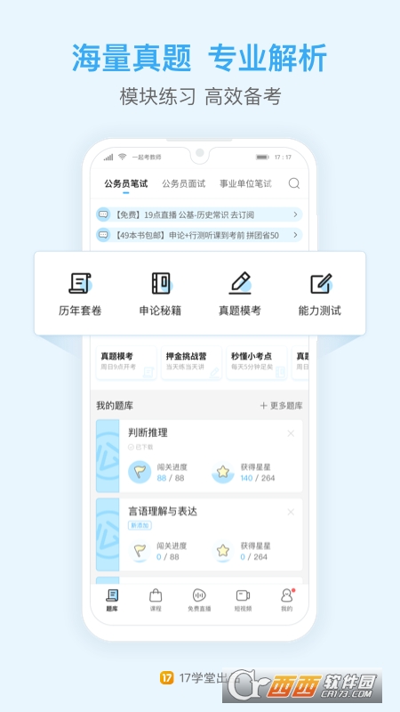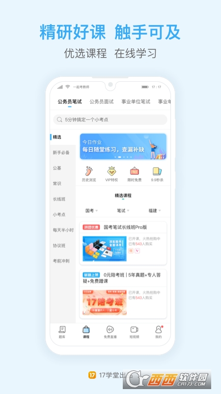 由17学堂出品,承袭一起考教师爆棚口碑。名师直播、闯关刷题、万人模考,学练测评一站式学习平台。公务员省考、国考、事业单位考试必备的提分利器!