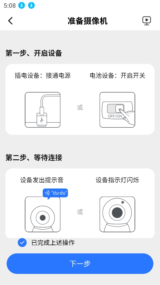 3、开启设备,等待设备发出提示音或指示灯闪烁,点击“下一步”按钮;