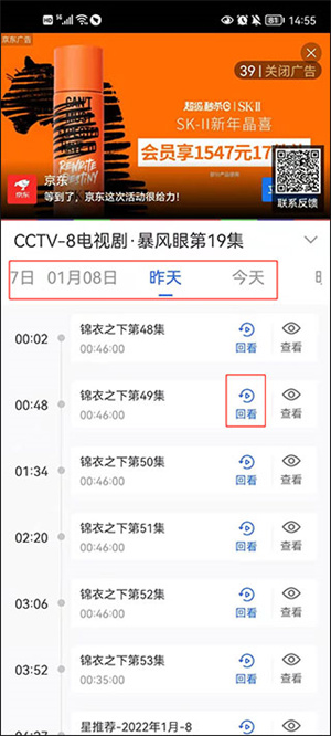 4、在频道单当中可以看到回看按钮,选择你想看回看的时间,点击进入即可看到节目播放时间点,点击时间点即可观看回放。