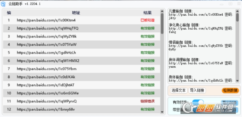 云链助手(百度链接检测),论坛用户制作的一个百度云链接批量检测小工具,能检测链接资源是否有效,此外还有一些密码显示效果。云链助手支持批量链接导入查询操作,对于经常接触百度云资源的朋友们来说是一个很好的资源维护管理帮手,需要一款百度链接检测工具的朋友们可以试试哦!