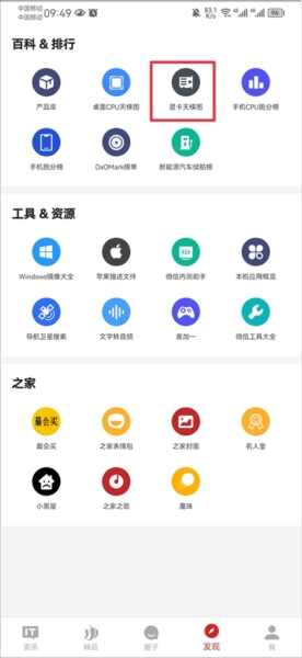 1、在发现界面中为用户提供了百科排行、工具资源、之家三大类功能,在百科排行功能中点击显卡天梯图