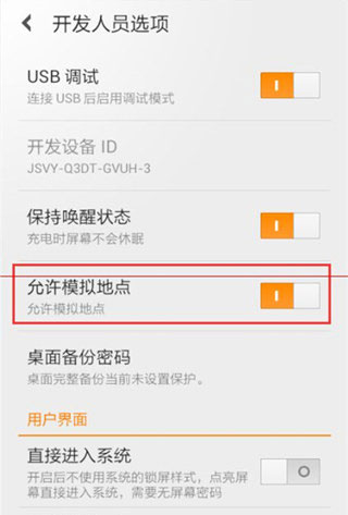 3、若手机未获取root权限,需打开手机系统设置,找到「开发人员选项」,并将「允许模拟地点」设置为开启。