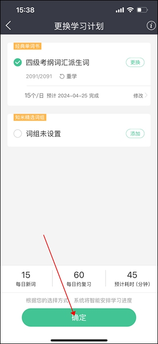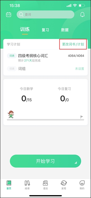 1、打开知米背单词app,进入到app首页,点击页面上方的“更改词书/计划”按纽;