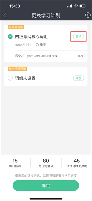 2、进入到更换学习计划页面,点击当前词书选项右侧的“更换”按钮;