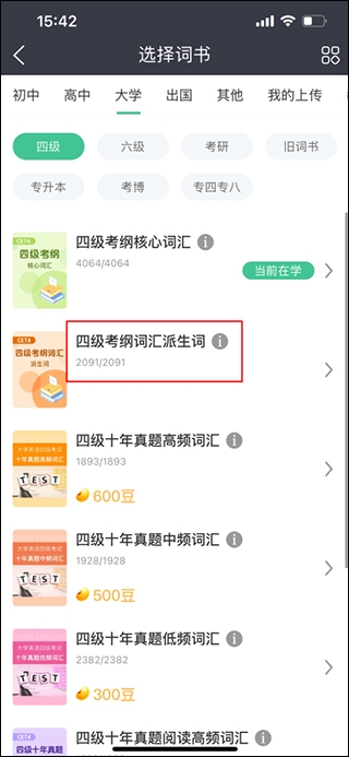 3、进入到选择词书列表页面,在此页面选择需要更换的词书并点击进入;