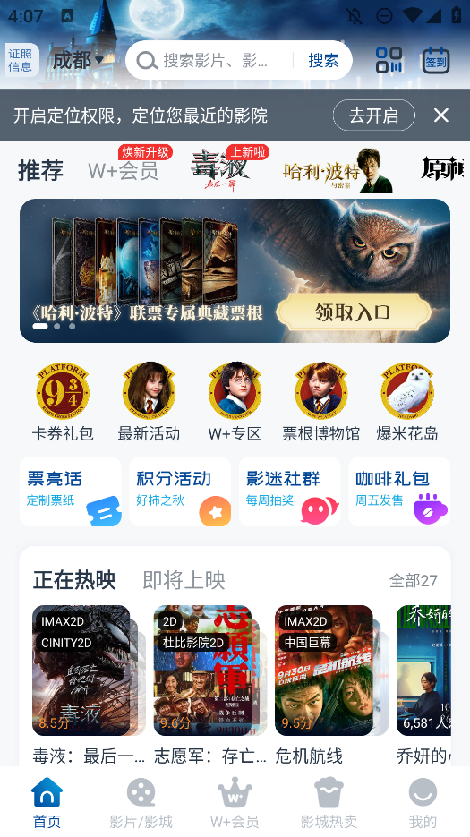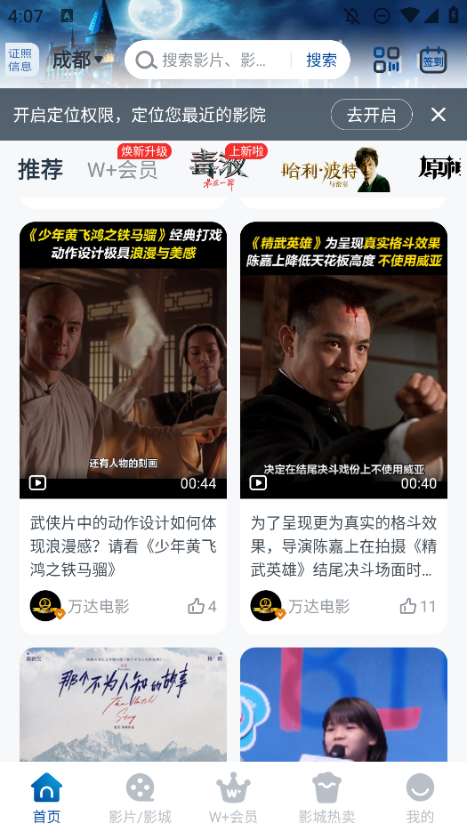 1.下载并安装好万达影院app(万达电影)后,根据你所处的位置进行购票选择,默认系统会自动定位,如若定位失败可尝试手动选择,如图所示,点击右上角。