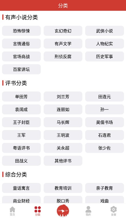 2、通过分类功能,我们可以看到有声小说分类、评书分类以及综合分类;
