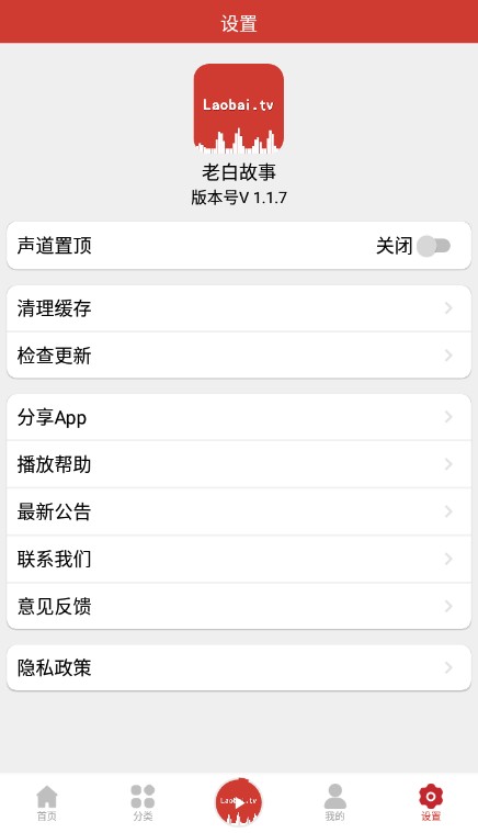 4、设置页中,我们可以设定声道置顶、缓存清理、检查更新以及分享应用。