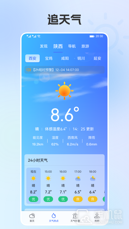 "陕西气象"是一款专注于提供陕西地区天气预报和气候信息的便捷应用,用户可以通过该app快速查看未来几天的天气情况,包括温度、湿度、风力等详细数据,帮助他们合理安排出行计划并做好防范措施,还提供实时更新的空气质量指数(AQI)数据,让用户随时了解陕西地区的空气状况。
