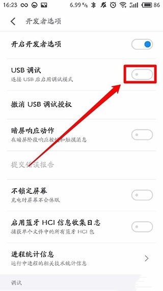 进入“开发者选项”后,点击“USB调试”,让它打开;