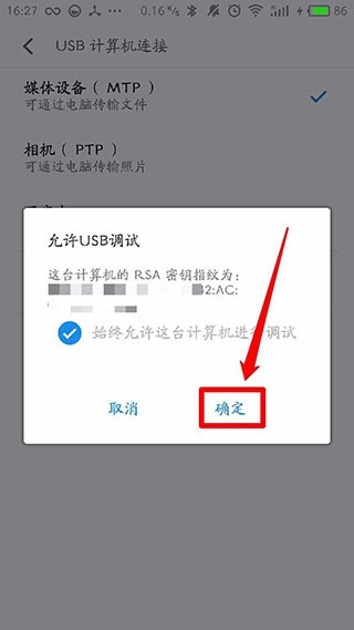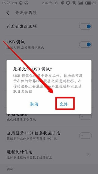 会弹窗询问“是否允许USB调试?”点击“允许”;