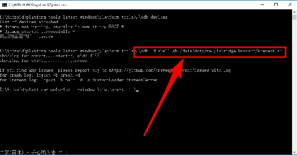等会以后,就会列举出来设备,然后输入命令“.adb -d shell sh /data/data/me.piebridge.brevent/brevent.sh”,完成对黑域的授权;