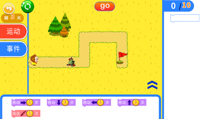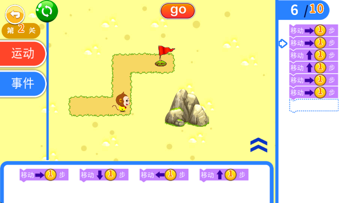 通过悟空一行西游取经的故事,通过搭建程序积木块,实现移动、攻击打怪、解救师傅等环节。寓教于乐,轻松学编程。
