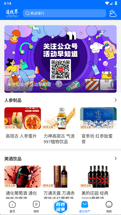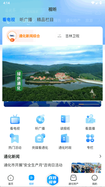 1、打开通视界,可以看到首页上方有着热点新闻、看通化、服务等板块内容。