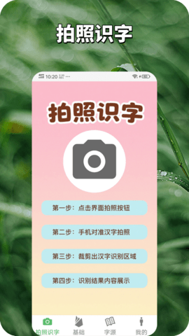 软件为用户提供了拍照识字的工具,利用手机的拍照模式来轻松识别汉字,一键识别查找。
