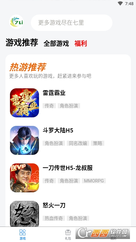 七里游戏手机版,七里游戏盒子专注手游资源,游戏礼包和游戏攻略内容,为您带来专业的游戏资源推荐项目。您可以在七里游戏app上查看最新的游戏内容,领取礼包,参与游戏限量测试活动,在感受各类手游乐趣的同时还能白嫖一波极品装备,喜欢玩手游的朋友们快来试试吧!