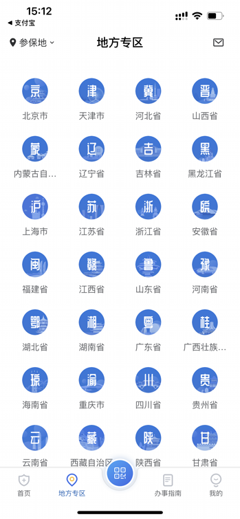 1、打开国家医保服务平台app之后选择下导栏中的地方专区并选择你所投保的省份。