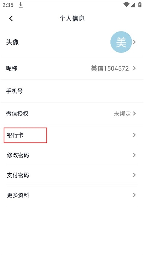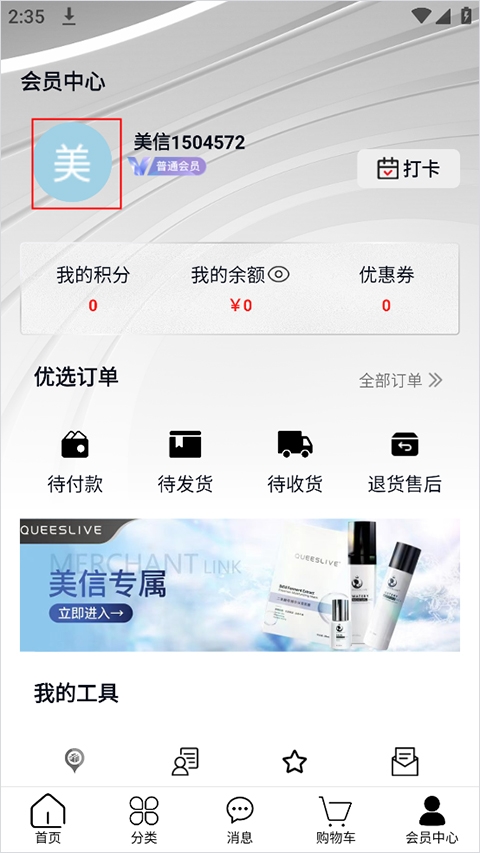 1、打开美信优选app,进入到我的界面,再点击“头像”图标按钮;