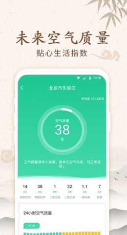 3,空气质量,实时监控,用户可以在软件中查看各种不同类型的天气数据和空气质量,全天的空气质量变化都会在后台进行渠道完整的收录,让用户可以更好的安排防护,体验轻松的生活。