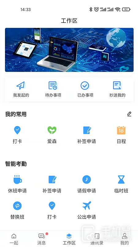 【工作区】支持员工公出申请、休班申请、补签登记和出差申请的提交审核和记录排班班组等功能