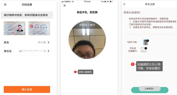 说明:活体实人认证失败超过三次的考生须上传身份证正面照片,待系统省级管理员完成实名认证审核后才可以登录系统进行报名信息完善;持港澳台等非居民身份证考生注册时须上传证件正面照片,待系统省级管理员完成实名认证审核后才可以登录系统进行报名信息完善。