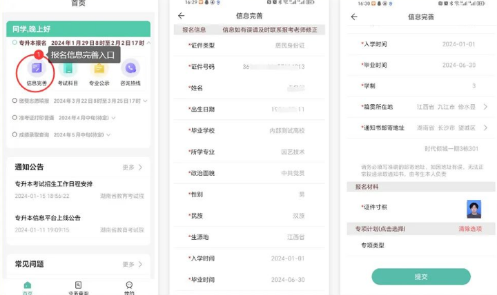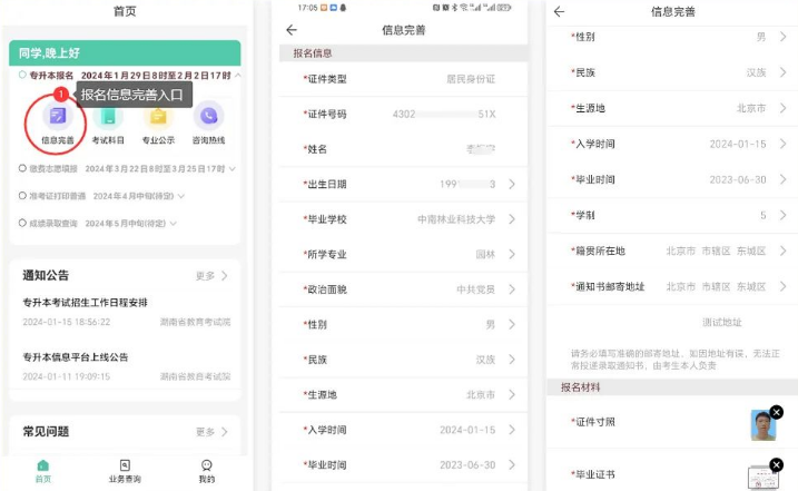 通过潇湘专升本APP的"信息完善"功能完善报名信息。