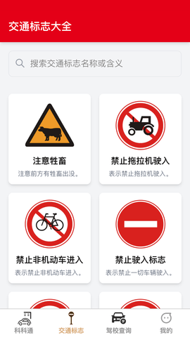 还提供了线上专属的交通标志大全,对需要的交通标志都可查看,随时搜索交通标志的含义。