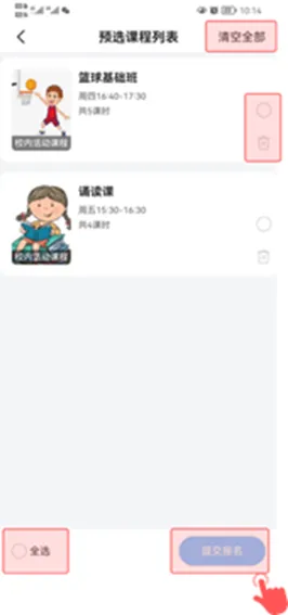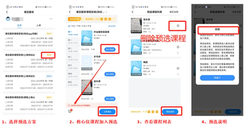 预选阶段可将意向课程加入待选列表,系统根据课程容量自动处理超额情况;家长可实时调整预选课程组合。