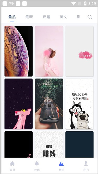 4、在"壁纸"中分为最新、最热、专题、美女等。