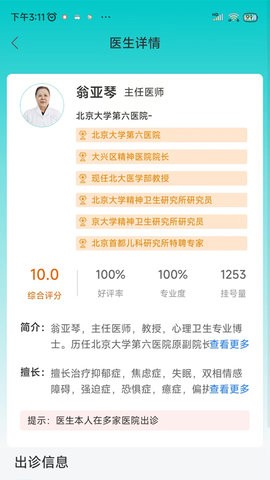 对每位医生进行了详情介绍,用户可以查看医生的个人简介了解医生擅长的医疗领域。