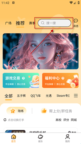 1、寻找陪玩师流程打开 APP→进入 “广场推荐”或搜索栏输入游戏名称。