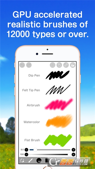 G笔,笔,数码笔,气刷,圆刷,平刷,铅笔,油画颜料,木炭,蜡笔,邮票等超过12,000种画笔图案