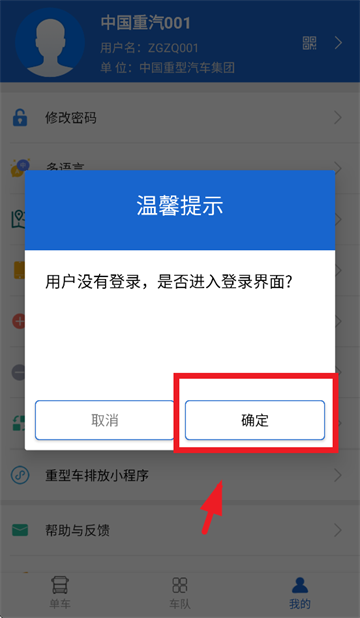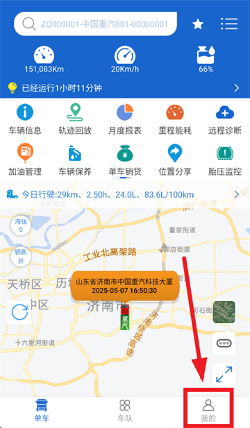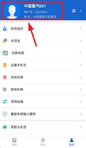 下载安装并打开重汽智能通app,进入单车首页后,点击我的